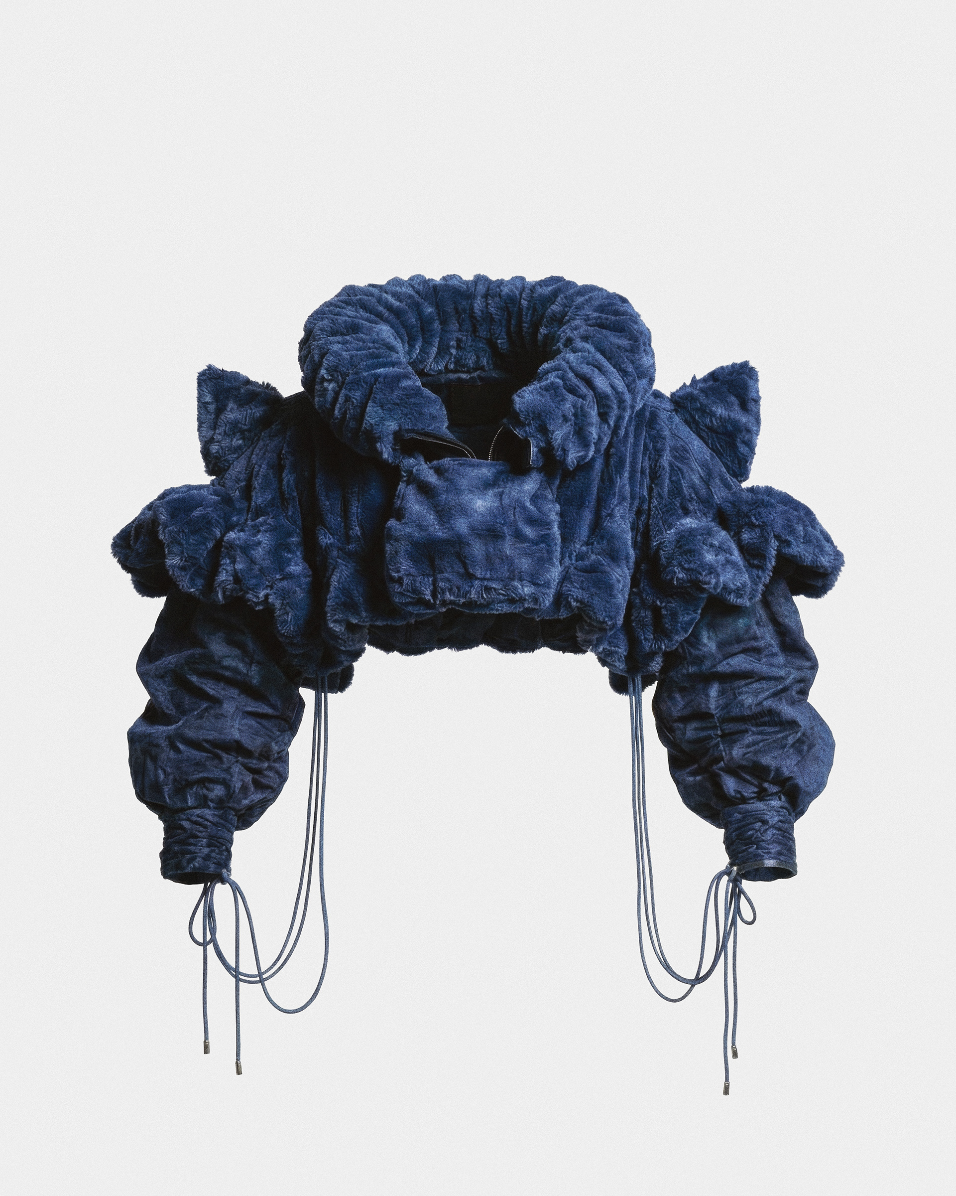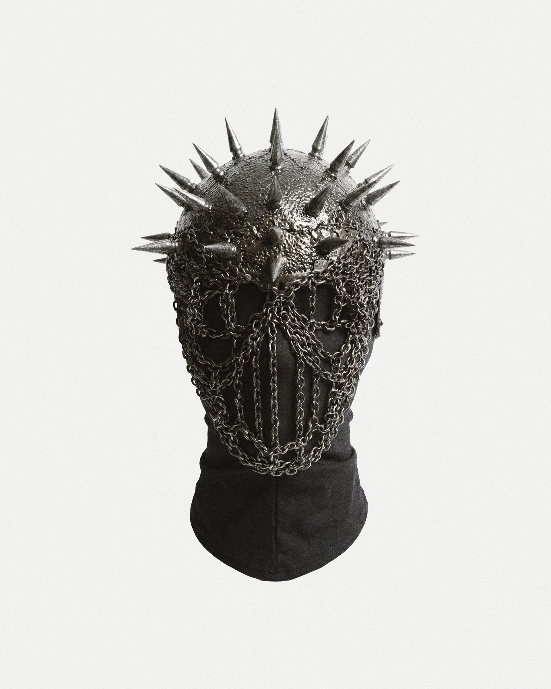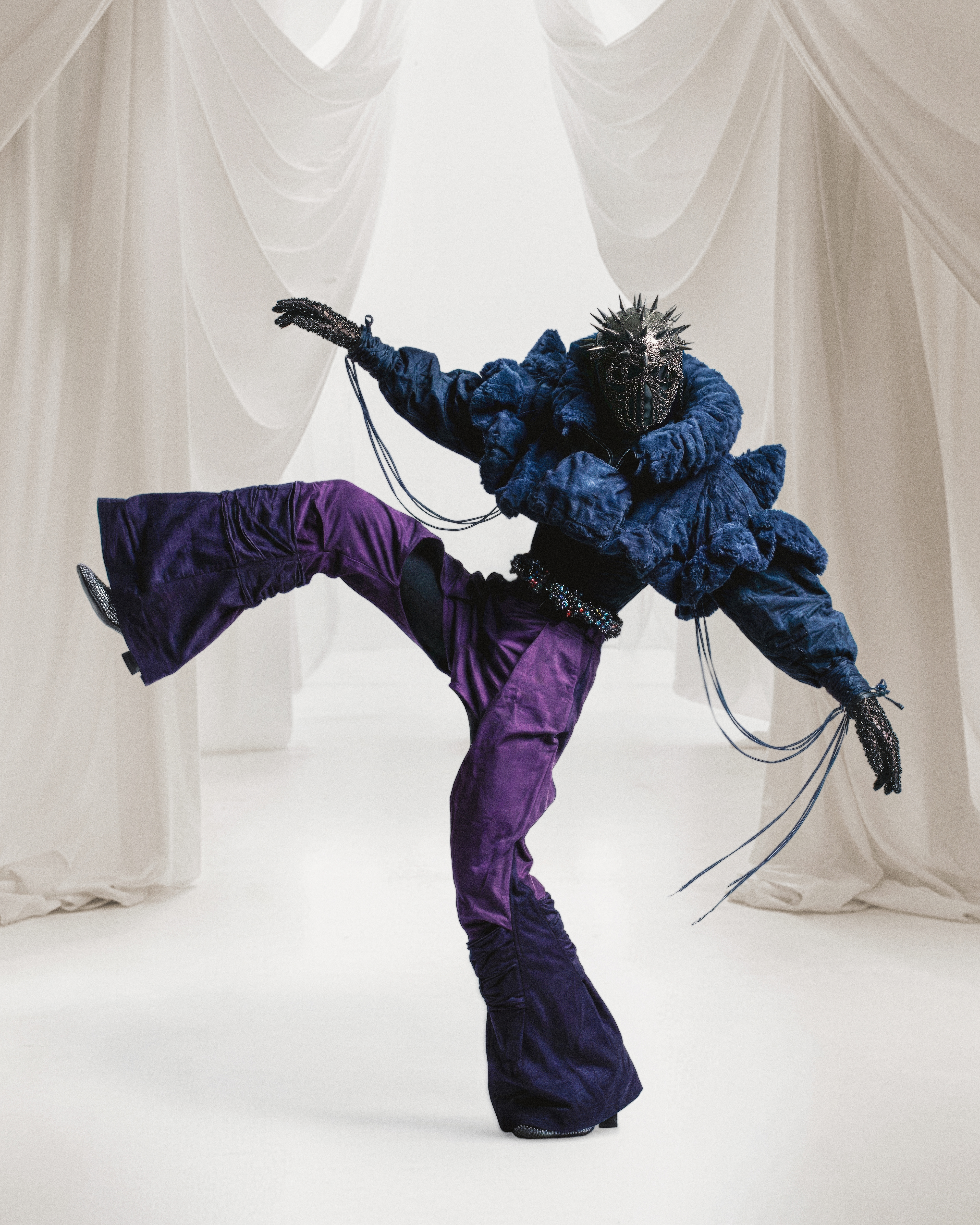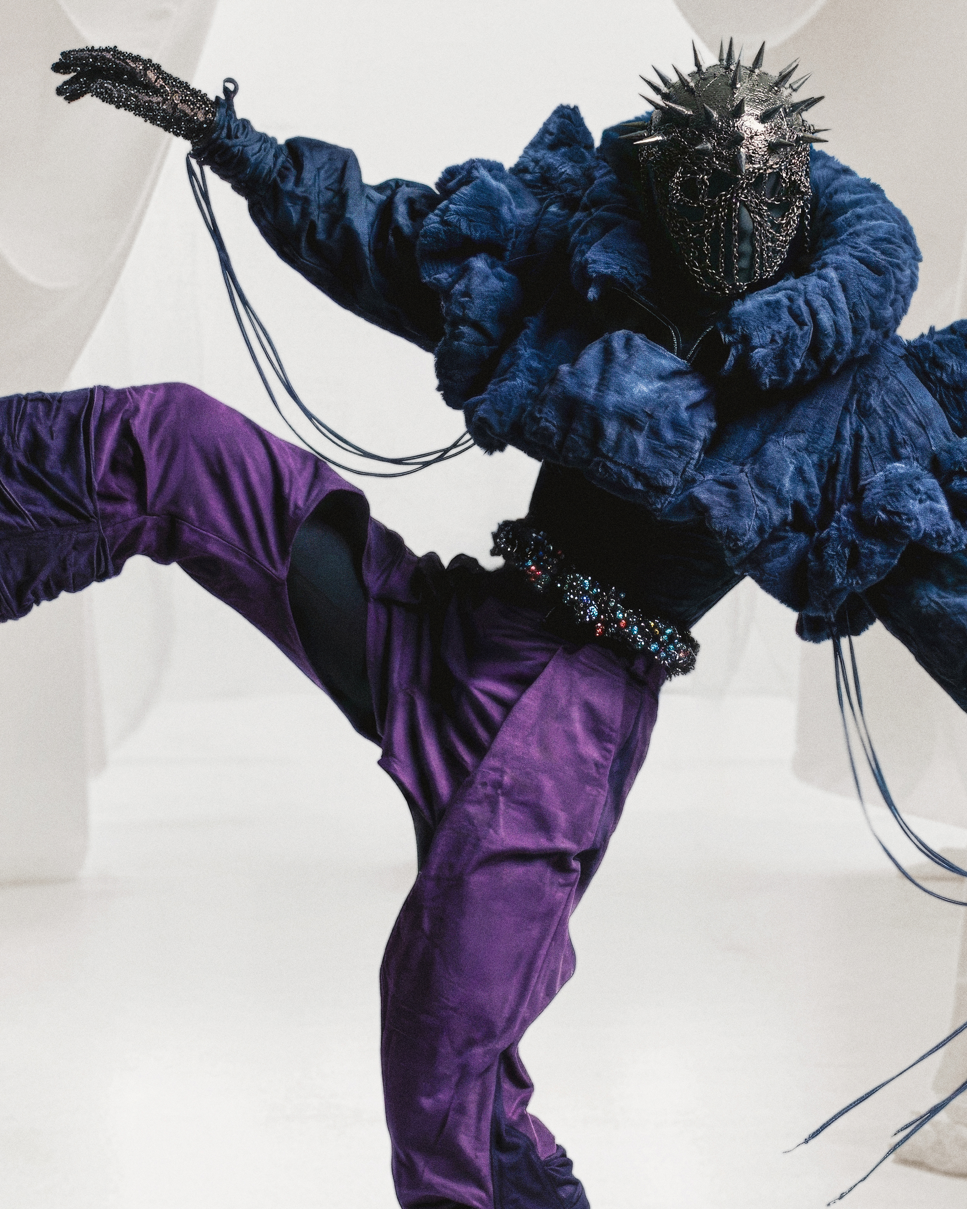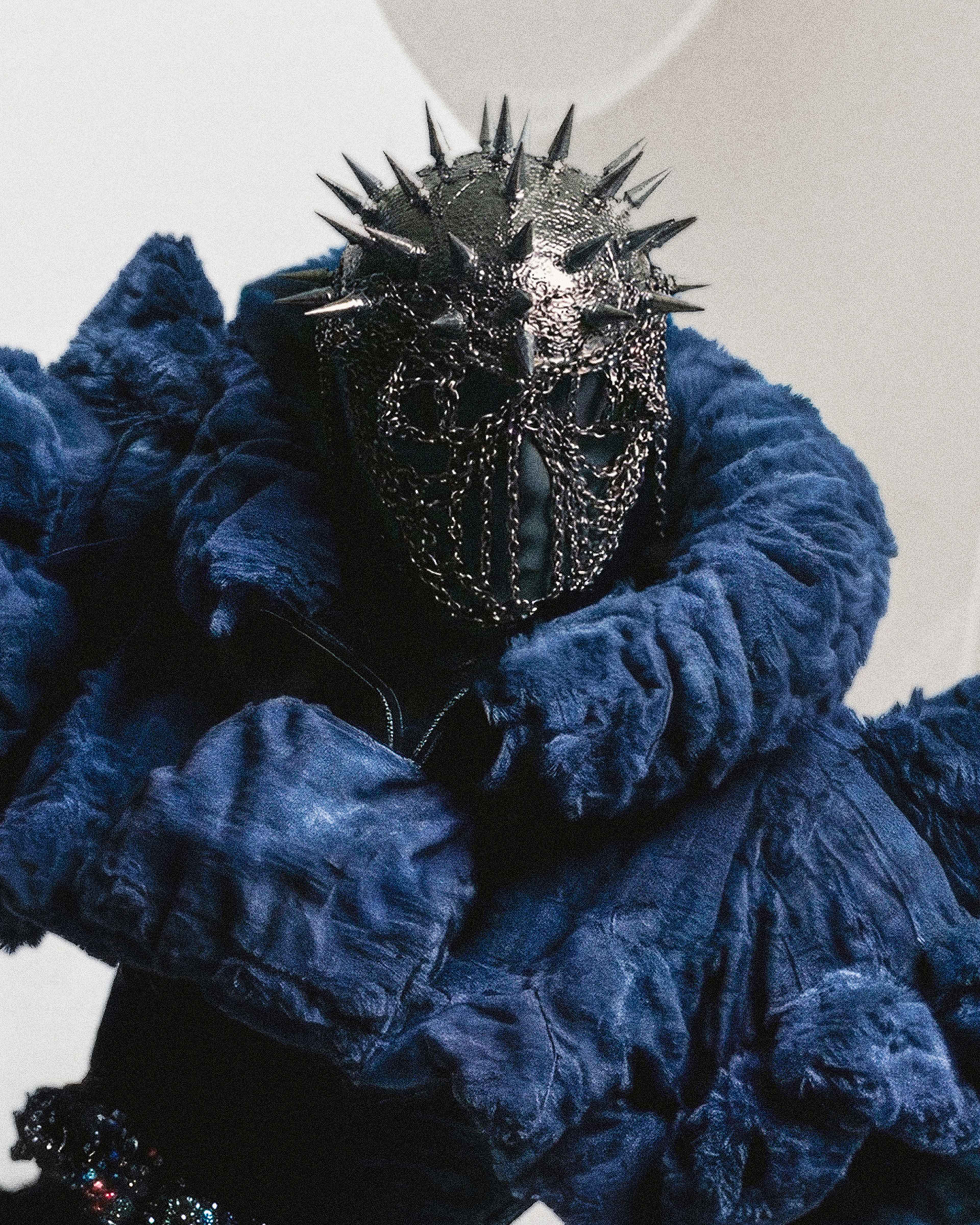 I built this look to explore the weight of isolation. A violent texture clash: the suffocating comfort of the indigo fleece against the granular friction of the shimmering sequins. A soft fortress, protected by a brutal, spiked visage. The body is hidden, but the intent is clear: DO NOT APPROACH.